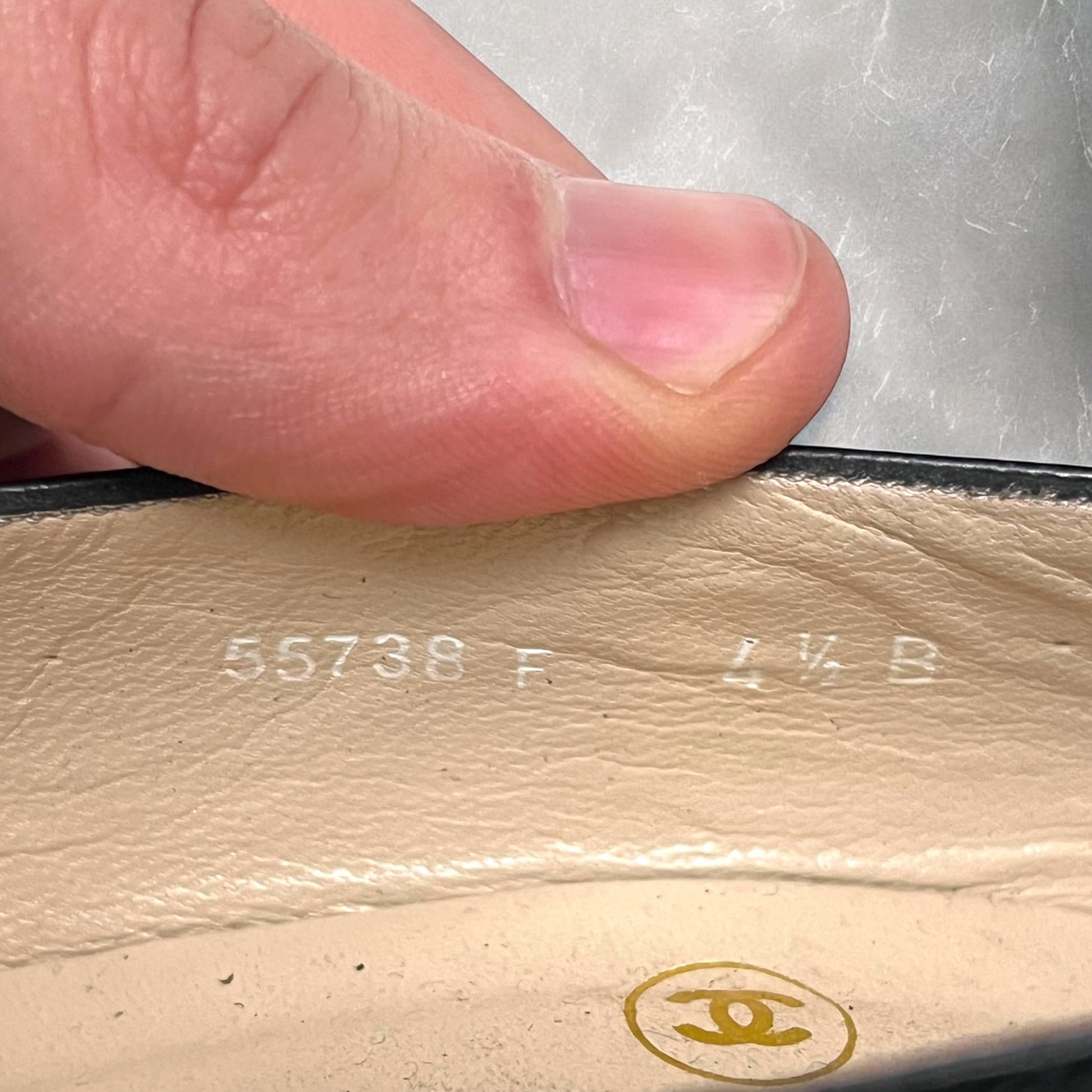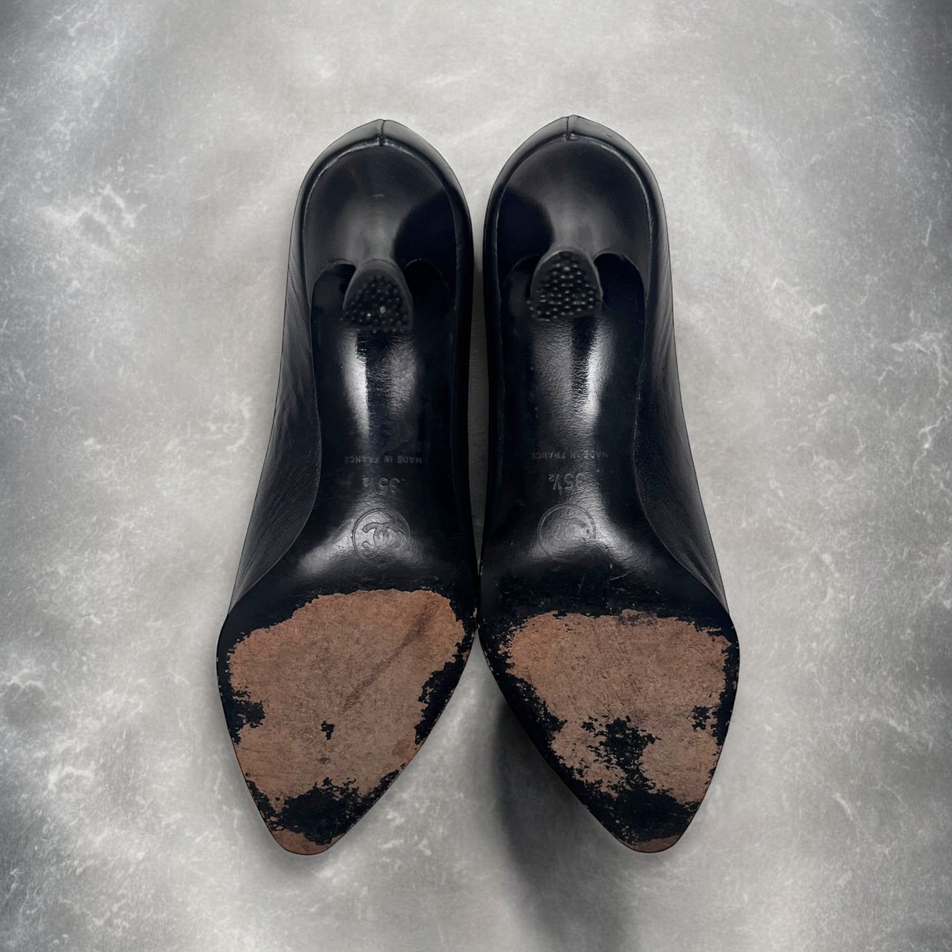 Black leather heels with embossed CC logo on toe