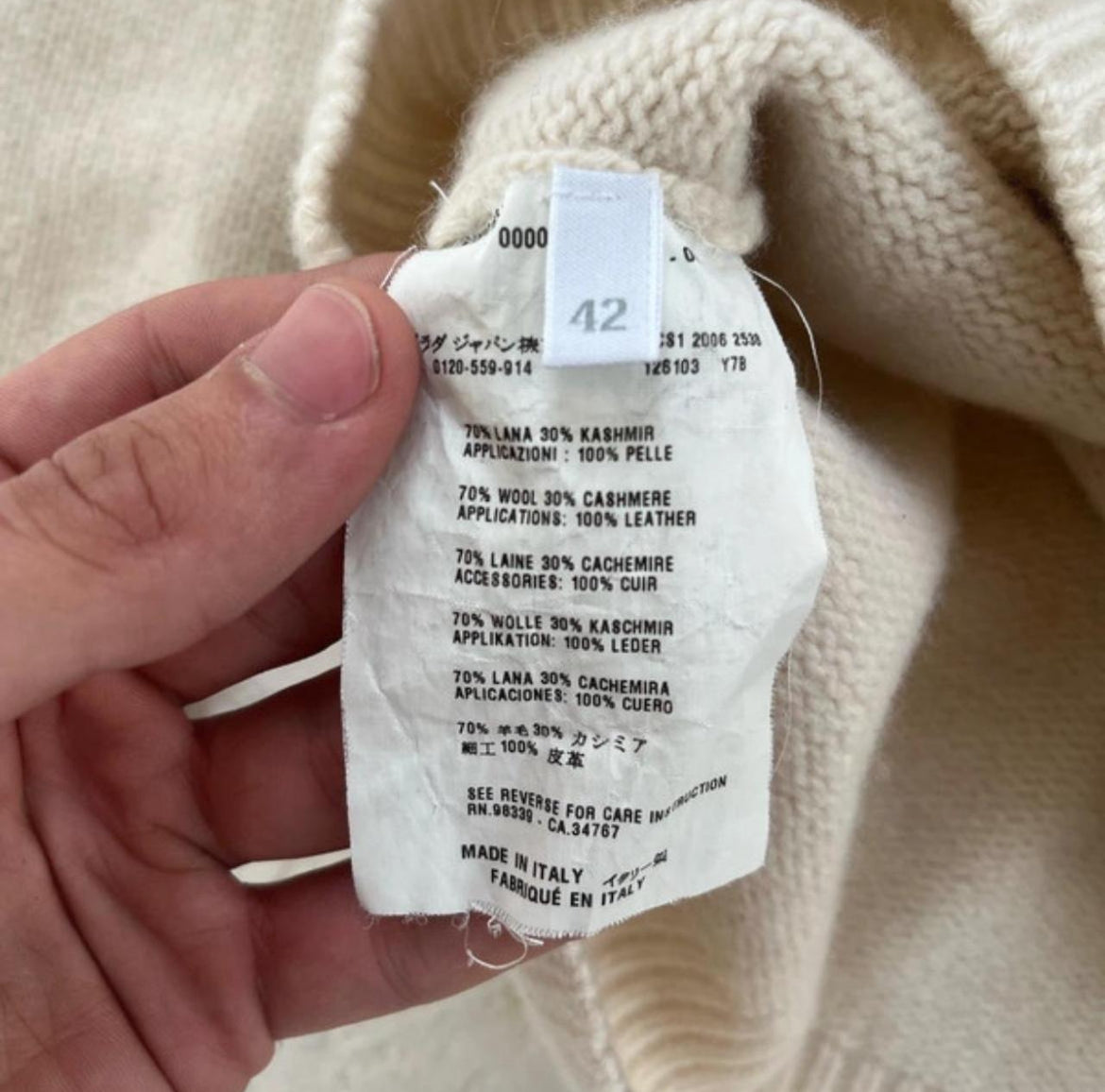 Cream Prada Mainline cashmere wool blend knit with lambsleather patches on elbows with brown leather tab on side